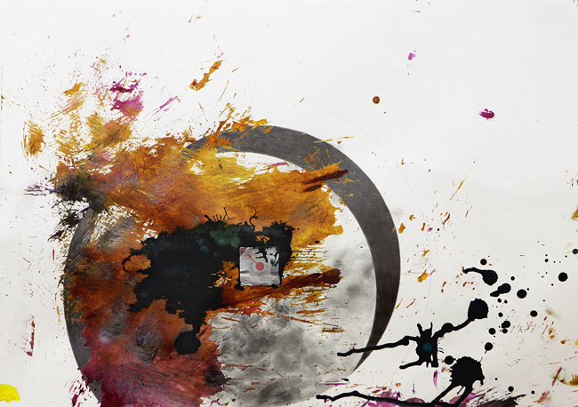 Untitled (Circle), colored ink, graphite, charcoal, RFID security tag, human hair, dirt on paper, 23in. x 16.5in..jpg)